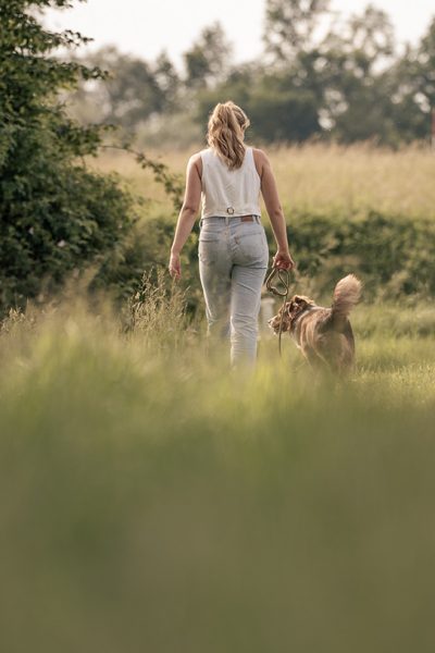 Sofort war uns klar, dass wir Bonnie an diesem Tag keinen Spaziergang über teilweise sonnige Abschnitte zumuten wollten. Wir wählten stattdessen einen schattigen, ruhigen Ort als festen Fotopunkt. Die Seniorin Bonnie kam natürlich zuerst dran. Als entspannte ältere Dame hatte sie innerhalb von ein paar Minuten ihren Modeleinsatz abgespult und die Bilder waren im Kasten. Danach durfte sie im Schatten chillen. Und wir hatten Zeit für Moose. Der freute sich über die kurzen Actioneinlagen mit Bianca und es entstanden sehr dynamische Bilder.